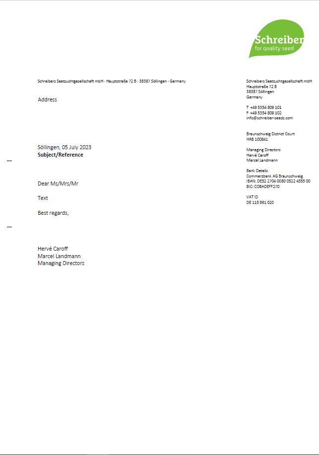 The right column is reserved for the logotype and sender details, the correspondence text doesn’t reach the right page margin. The sender details can be individualized for the respective editors. No further changes to the layout or lettering are permitted.
