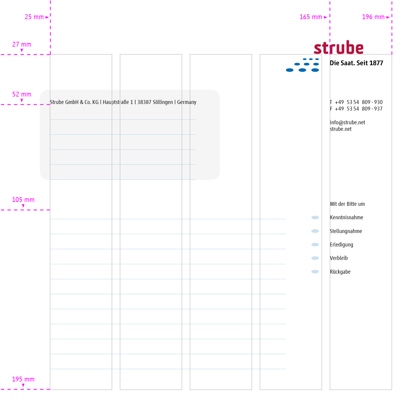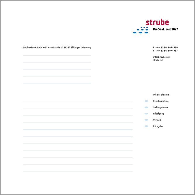 To print the short letters in the format 210 x 210 mm please use one of the following files: kurzbrief_210x210_strube_de.idml; kurzbrief_210x210_strube_de.pdf; compliments_slip_210x210_strube_en.idml; compliments_slip_210x210_strube_en.pdf